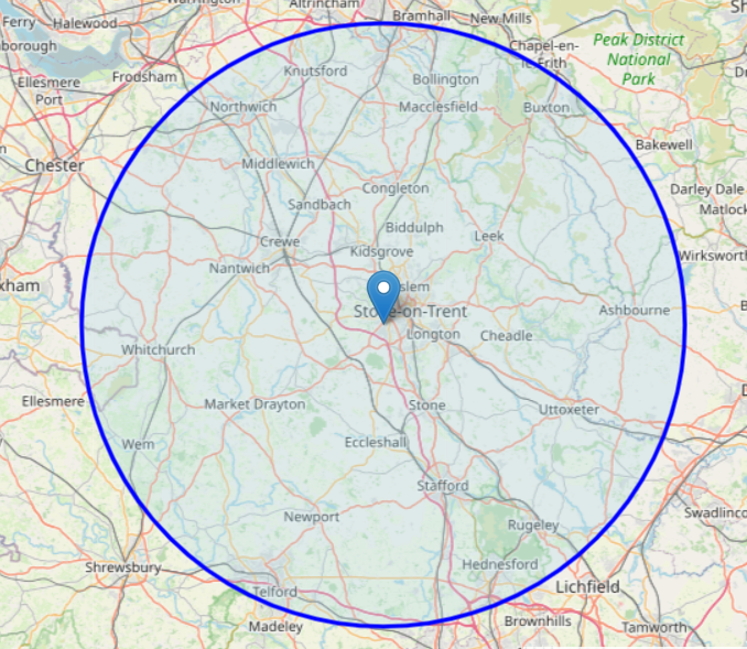 Stafford • Stoke-on-Trent • Newcastle-under-Lyme • Stone • Eccleshall • Crewe • Nantwich • Alsager • Congleton • Sandbach • Uttoxeter